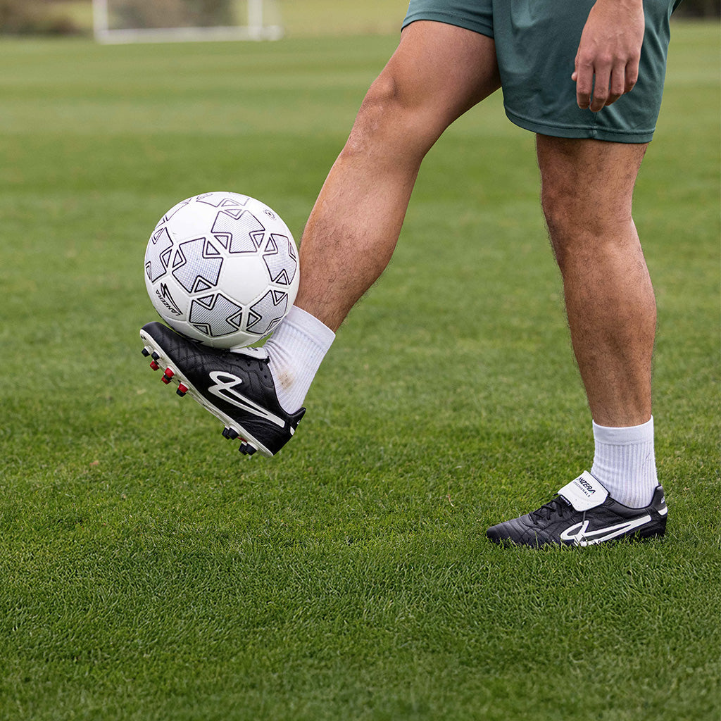 Cuenta con sistema de cordones de ancho variable, correa de soporte para la parte trasera del pie, talonera de nailon premoldeado para soporte adicional. Lengüeta "profesional" ligeramente acolchada con etiqueta tejida para un mejor contacto y "sensación" del balón. Tabla duradera reforzada para permitir una flexión adecuada del antepié y estabilidad torsional. Para ser utilizados en campos de hierba natural.
